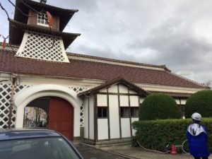 施設内で1期工事の耐震補強の概要や2期工事の外壁修理(漆喰塗り)の話をお聞きしました。