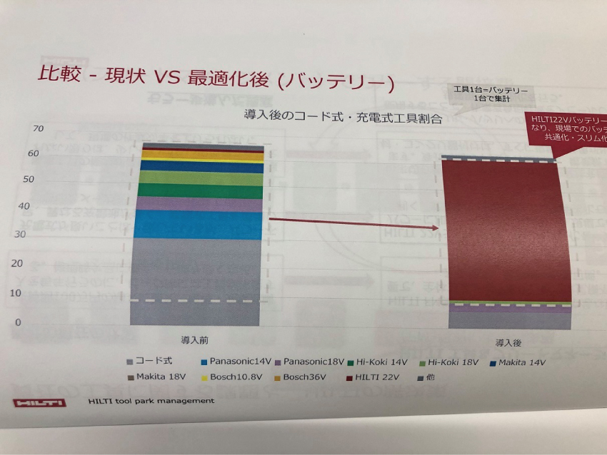 電動工具にコストの多くは、購入後の修理に始まり、多数のメーカーを使用している為に互換性がないバッテリーの消耗による交換、経年による工具の能力ダウンなど多数あるため、弊社では、主力電動工具に購入を取止め、メーカーを統一してのリース契約する事にいたしました。最新の工具でコードレス化と、常に最適な状態で使用でき、現場での作業効率もアップすると思います。又、スマホとクラウド活用する事により、工具などをスマホや会社のパソコンから検索して所在を確認できたり、社内の管理情報を一元管理する事により業務効率を向上していきます。
