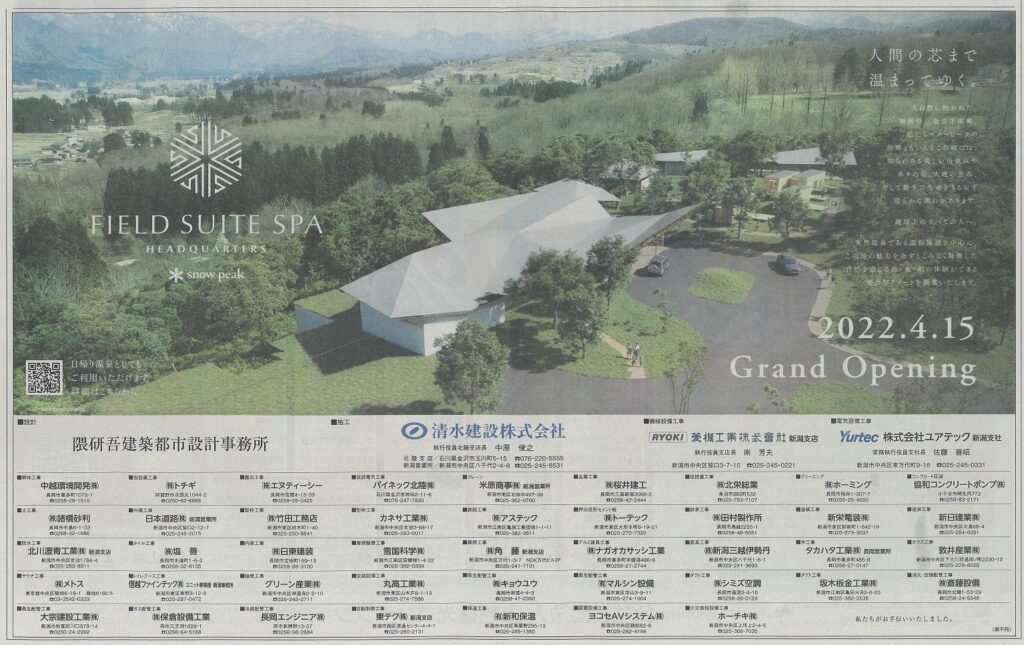 弊社も屋外の給排水・源泉設備工事のお手伝いをさせて頂きましたので、4月15日(金)の新潟日報の新聞広告に掲示もさせて頂きました。