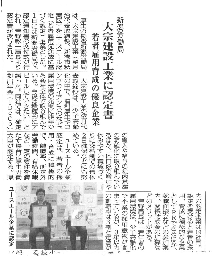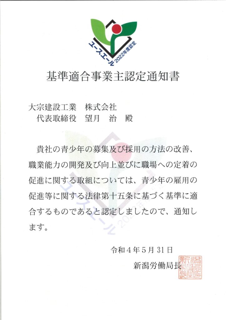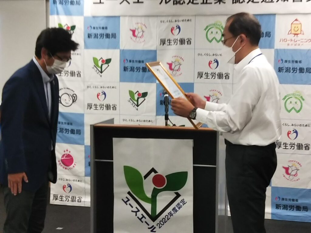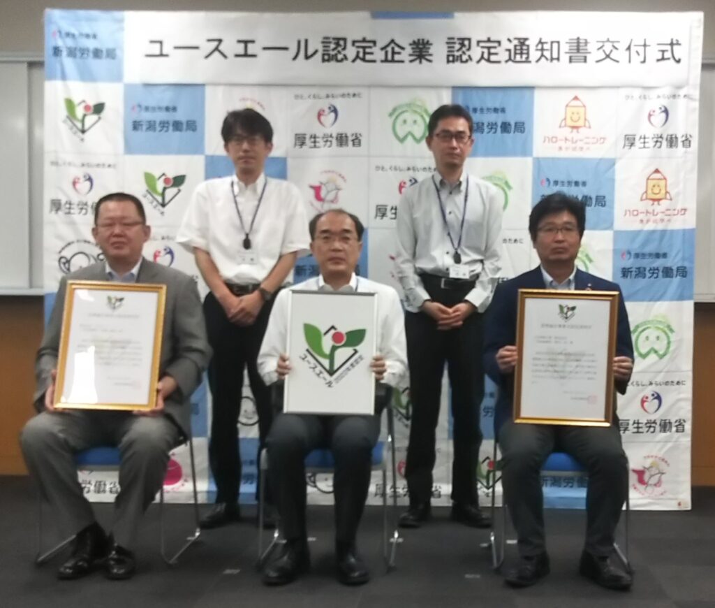新潟労働局長から認定通知書を手渡して頂きました。これからも積極的に若者採用の推進と育成に努めていきます。