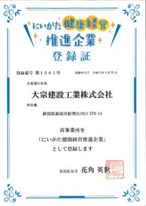 先日、新潟県の「にいがた健康経営推進企業」に登録いたしました。これからスタッフの健康管理に積極的に取組み、より働く世代の健康づくりの促進を図っていきます。