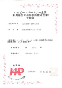 ハッピー・パートナー企業に応募し、この度、登録証をいただきました。 これからも男女ともに仕事と家庭等の活動が両立できる環境づくりや働き方の見直し、女性労働者の育成・登用推進などの取組に努めていきます。