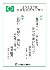 2022年度がスタートいたしました。 今年度の弊社のスローガンは 【安全】 安全は一人一人の心がけ みんなで声かけ合って 安全作業 工事部 井関 宏 【衛生】 目配り 気配り 思いやり みんなで守ろう 快適職場 工事部 […]